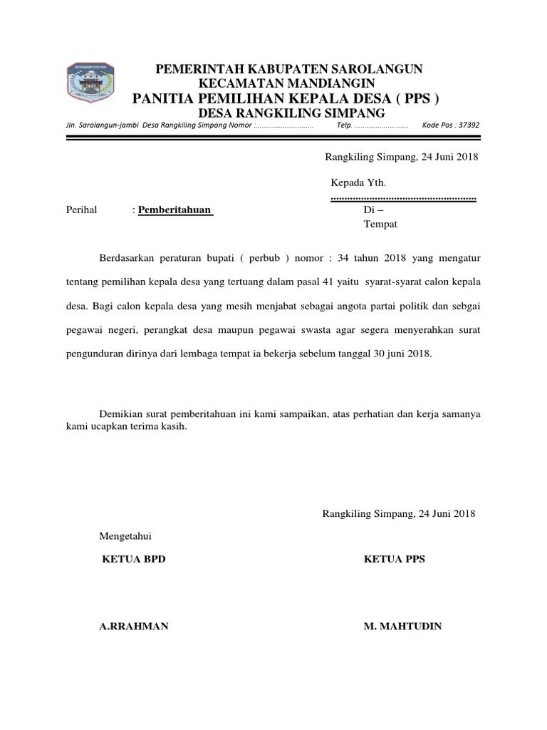 Dusun cangcaem dengan ini saya menyatakan mengundurkan diri dari keanggotaan badan permusyawaratan desa (bpd) desa selir kecamatan wong feihung kabupaten. Cocok digunkan sebagai surat pengunduran diri dari jabatan di pemerintah desa, seperti ketua rt / rw. Fungsinya adalah untuk melegalkan status tanggung jawab di perusahaan dan persyaratan administratif. Entah bagi yang ingin resign dari tempat kerja di perusahaan yang selama ini ia bernaung di bawahnya atau dari jabatan tertentu. Contoh surat penguduran diri sangat banyak macamnya mulai dari pekerjaan, organisasi, sekolah, jabatan, guru, kuliah, perangkat desa, bahkan sampai tingkat rt/rw.